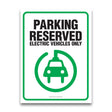 The "Reserved Parking - Electric Vehicle" sign is a traffic sign that notifies the individual that it is prohibited to park in the given area unless it is an electric vehicle. The sign only displays the parking "P" in a green circle, showing that parking is allowed given that it follows the rules set in place on the sign.